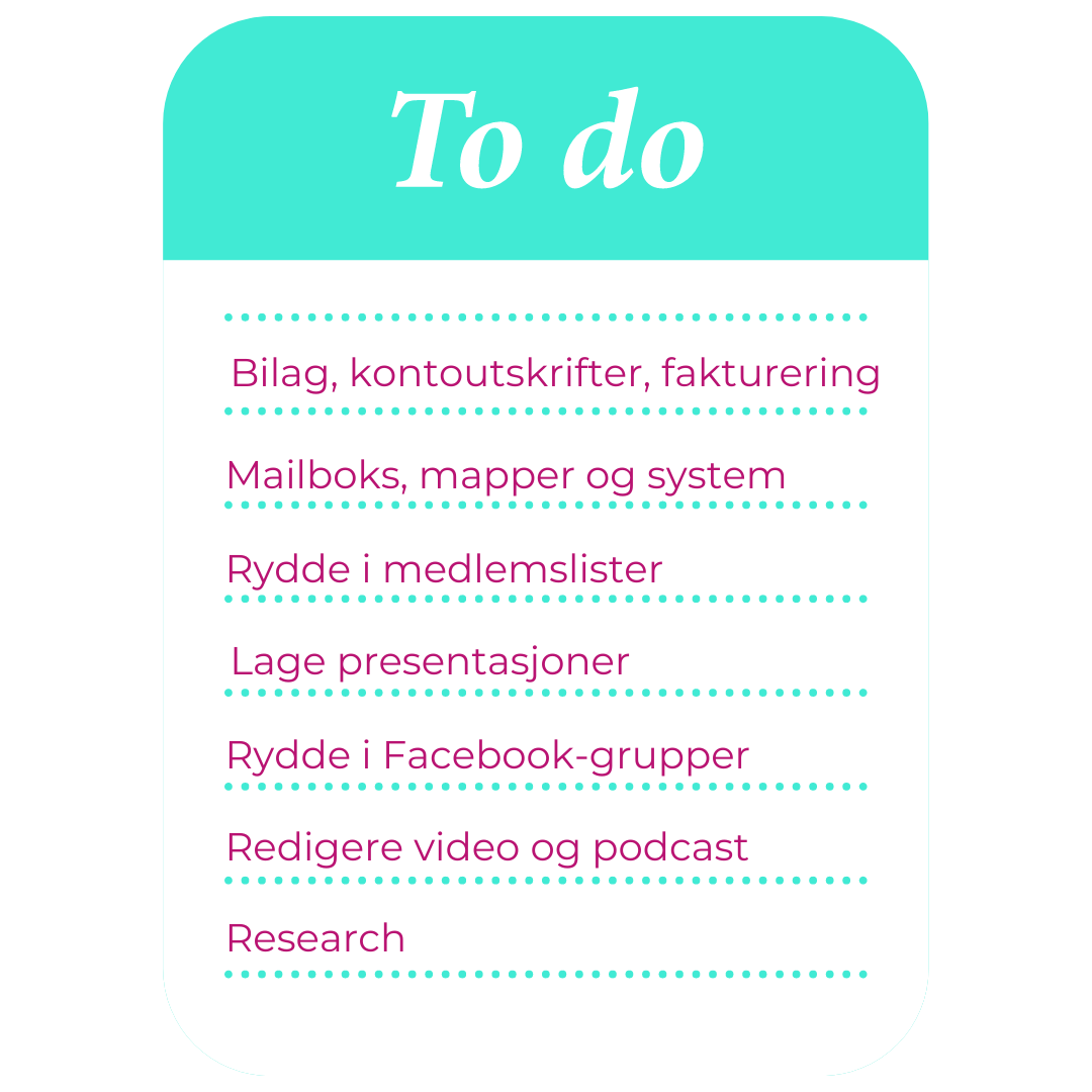 Har ikke døgnet nok timer akkurat nå? Eller du prokrastinerer fordi det ikke er det du liker best å gjøre? Du kan leie meg en dag for å få gjort en eller flere oppgaver du har utsatt i alt for lang tid, kanskje 1 år eller mer, hva vet vel jeg?